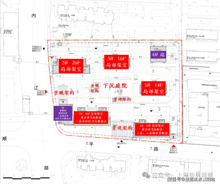 根据规划图所知, 项目拟建5栋14-26F住宅产品,以及1栋保障性租赁用房;2# 楼为26层高层,3# 楼为16层小高层,5# 楼为14层小高层,6# 楼为16层小高层,7# 楼为26层高层;8# 楼为8层保障性租赁住房;