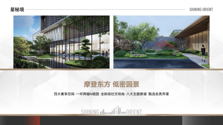 社区园林:“摩登东方” 园林规划中央景观客厅、颐乐空间、全龄活动区、儿童游乐区、健身区,四季有景、步步皆景,满足业主休闲、健身、社交需求。