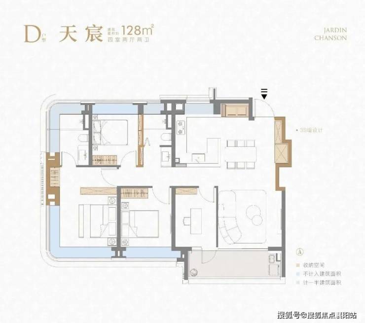 项目建面约128㎡4房户型 延续了前作3S墙的设计,保证了收纳空间的丰富性。