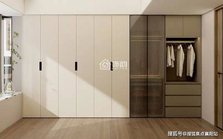 在主卧的对面,设计了一排柜子,充当衣帽间,我们以极简通透 + 功能分区为设计核心,打造一个兼具收纳力与颜值感的专属衣橱。