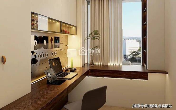 功能房以胡桃木色书桌与柜体为核心,沉淀出沉稳厚重的质感;搭配奶白色墙面与浅灰软装,中和了木色的厚重,让空间更显明亮。
