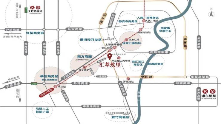 汇萃玖里 坐落闵行与徐汇区主城的交界的黄金中环地带,中环上中西路下匝口,虹梅南路与益梅路交汇处、东至虹梅南路(中环高架)、南至北潮港、北至益梅路。