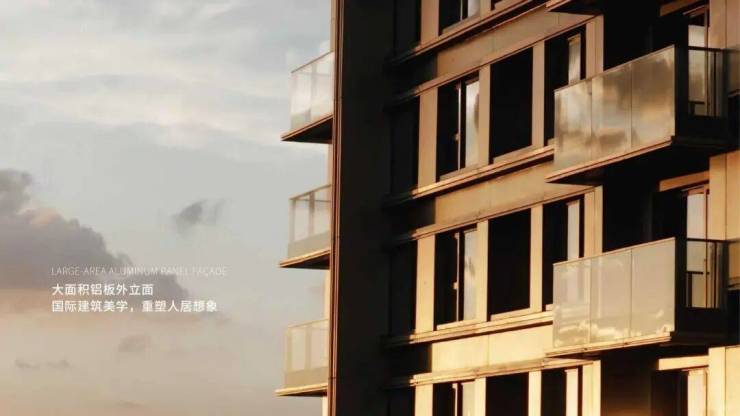 现代典雅立面,灰色搭配香槟金的色调,彰显不同建筑审美,外立面为品质铝板+玻璃幕墙,局部干挂石材和保温一体板,通过数控切割、精度弯弧、手工焊接、打磨抛光、七重清洁、烘干喷漆、高温定型等过十余步精细工艺,是高端住宅里高于行业标准体系的立面铝材。