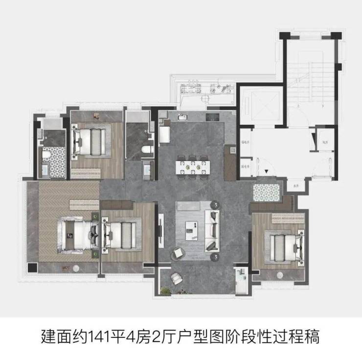 建面约127㎡直接进阶4房,功能性拉满,适配当下越来越多的二胎或三代同堂家庭。