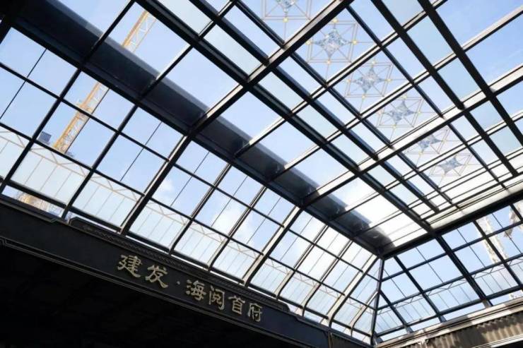 远看首先映入眼帘的是建发·海阅首府约10米挑高,以石材+玻璃穹顶打造的门头,整体形制神似外滩汇丰银行大厦,细节装饰又有外滩上海海关大楼的影子,海派建筑沉稳的气质扑面而来,让小胖君一秒回到外滩万国建筑群。