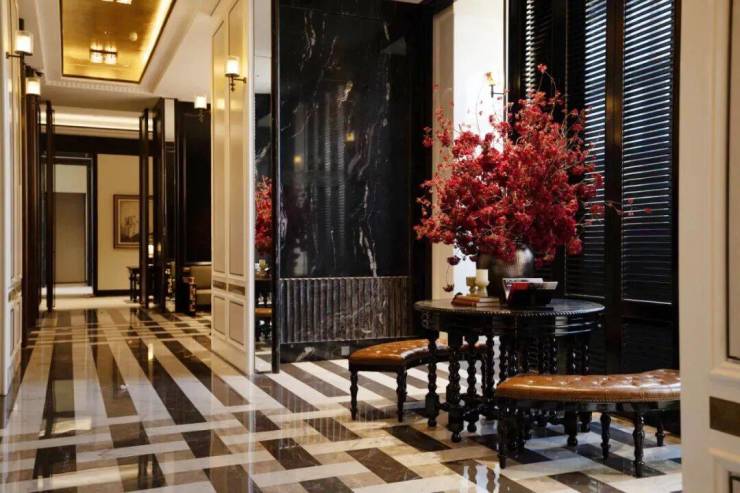 矗立两旁的是进口奢石巴西乌金石打造的大理石柱,庄重典雅。点缀画面中央的是玻利维亚蓝,这是世界上储存量极少的石材之一,被称为奢石中的劳斯莱斯。地面的拼花灵感来自伦敦瑰丽酒店,黑白相间,给我一种神秘厚重的感觉。