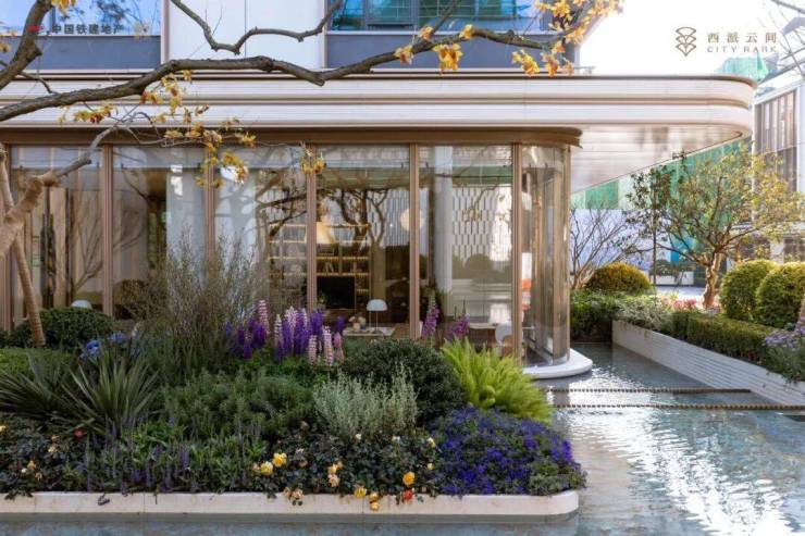 穿过森林便是利用地形高差打造的 云间谷 ,模拟山林间的徒步体验,两侧花境与红梅夹道,让你在社区内就能体验山间秘境的穿梭感。旁边的戏水池与 云间亭 ,则是夏日消暑、冬日观晚霞的绝佳去处 。