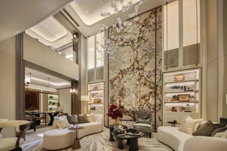 走过凌云桥,眼前便是挑高达9米、宽36米的鎏金门庭。 雅柏白与香格里拉奢石镶嵌的背景墙,配合旅德艺术家LilyZhang定制的“无限云环”雕塑,气场全开。门庭两侧背景墙,选用 巴西进口的整块白水晶奢石,天然石材的肌理在灯光下流转,温润如玉。当那扇手工锻打的鎏金铜门缓缓打开,对于别人是盛大的仪式,对于业主,只是日常 。