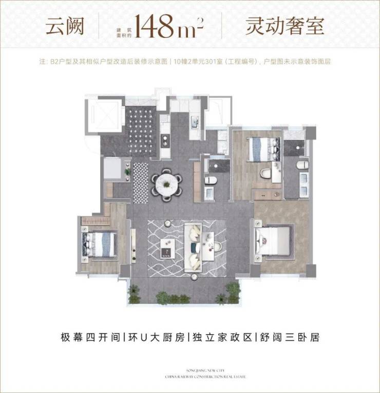 新政后松江板块首个 四开间朝南、且不封阳台的三阳台户型 ,实际使用面积超过原来的约140㎡大户型,实现“面积不变、体验跃级”的居住突破,质价比满分!