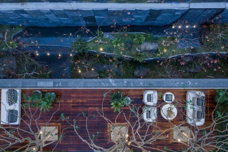 自【悬浮茶室】拾级而上,在【 思韵书院 】外,一处闲憩放空的【阅川水岸】至此呈现,脚下溪流自脚下蜿蜒而过;眼前,是 幻影蓝奢石池底 的幽邃微光。一株来自地 中海的油橄榄 ,与 一棵百年老桩紫薇 在此相望。