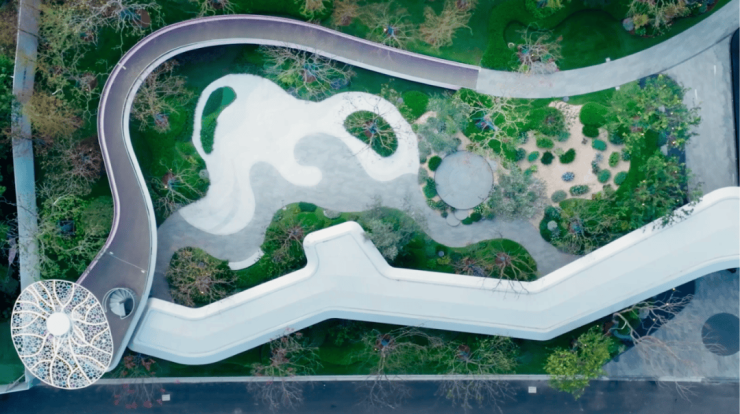 内部:约10000㎡立体都心园林 。以英伦名园邱园、希德寇特花园为灵感,以“三轴五园”勾勒“东韵西境”。