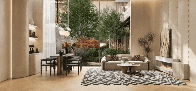 社区内打造 **“三轴一界一带” 沉浸式园林 **,以自然为基底,规划景观轴线、生态边界、滨水绿带,搭配丰富的绿植、水景、休闲景观节点,打造一步一景、四季常绿的社区环境。同时,项目打造 1500㎡下沉式 “社交引力场” ,配置室内篮球馆、恒温泳池、健身区、儿童乐园、会客厅等九大功能场景,满足全年龄段业主的休闲、健身、社交需求。