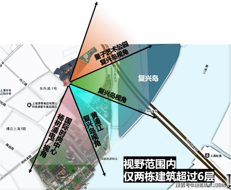 楼典将8号楼的建筑在卫星地图上叠加分析了一下,8号楼楼王整个朝南视野范围内仅有2栋超过6层(16-17层50米)的建筑,整体视野非常开阔,从复兴岛到黄浦江视野,几乎无遮挡。