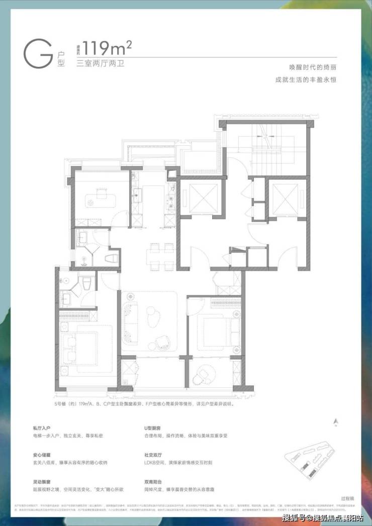项目所有户型都拥有“类独立电梯厅”或者独立电梯厅,入户私密性拉满的同时也增加使用空间。 该户型飞机户型格局,南北通透。