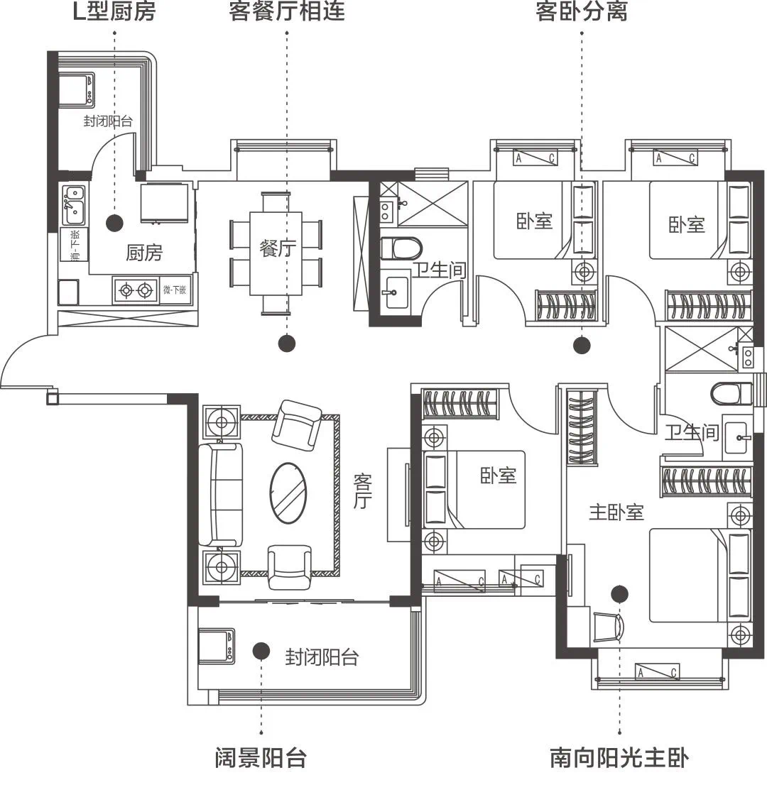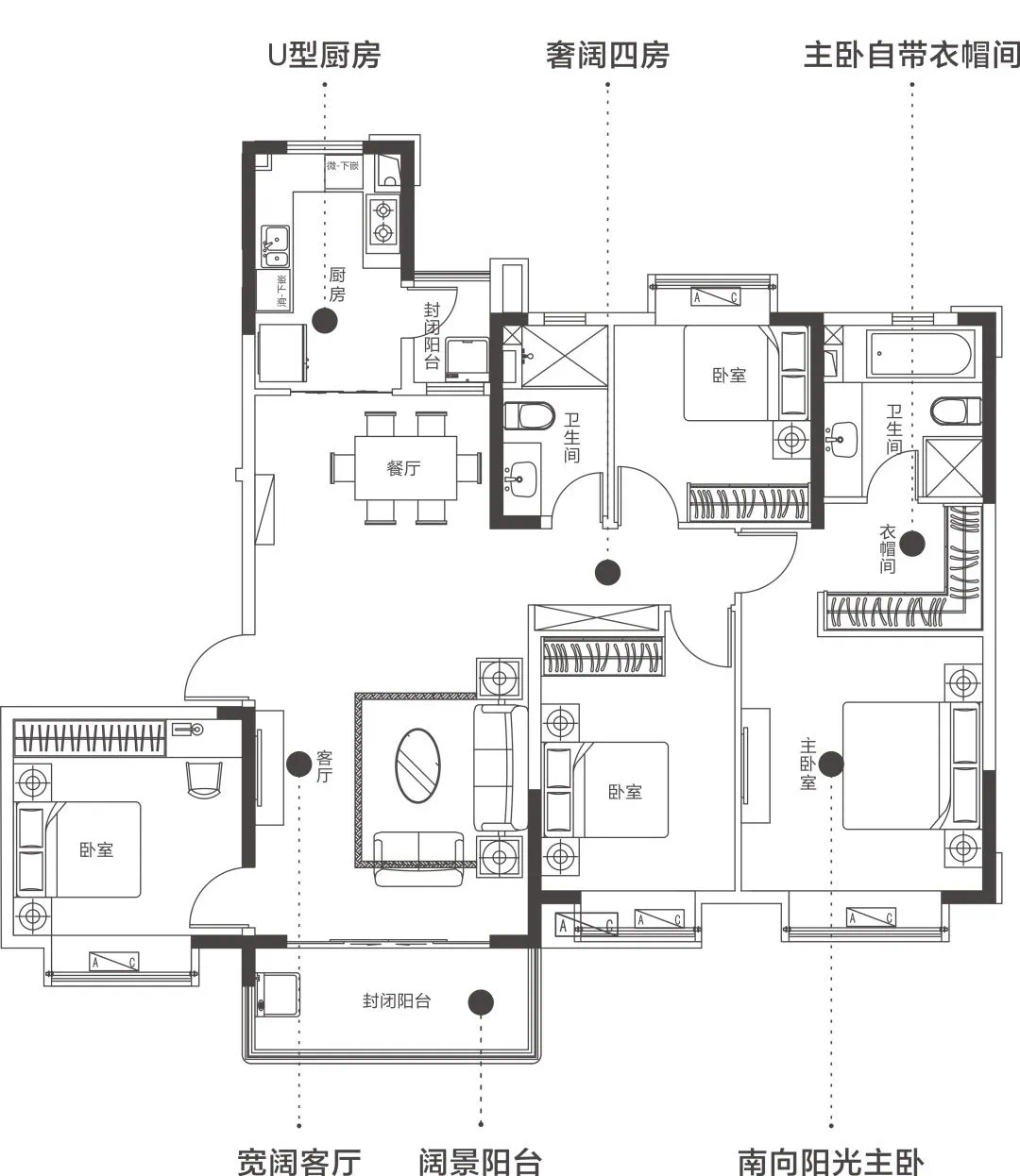 阔景四房从生活舒适度、私密性出发独立卫生间实现干湿分离超大观景飘窗,让清风阳光充分洒入私属衣帽间让换装与收纳皆充满仪式感每一个细节的精致设计无不将生活的质感优质呈现尽显私家港湾的优越与尊崇
