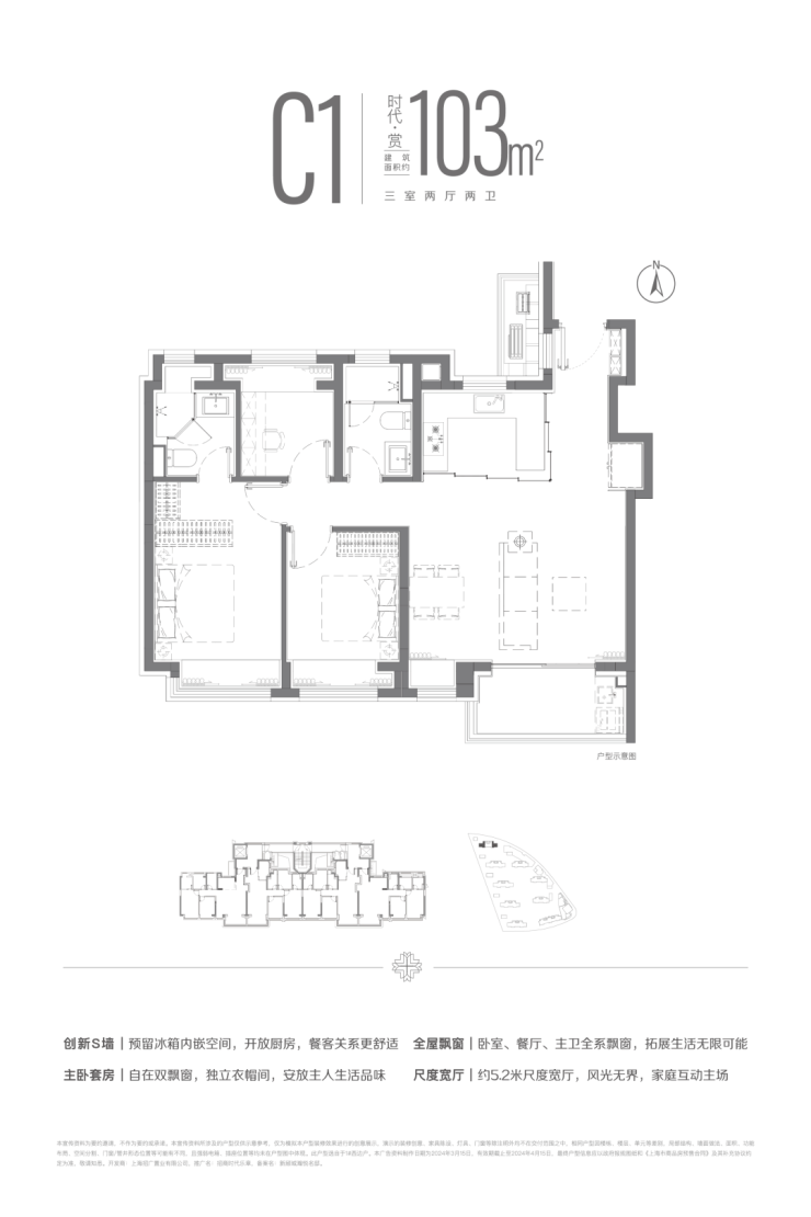 建面约103m²三房两厅两卫户型,南北双卧L型270°揽境飘窗设计,更大限度地让自然融入与自在之中,更宽阔的空间尺度,让自在生长与自然之中。