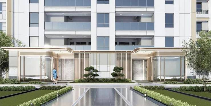 社区入口对标慢奢酒店风格打造,融入高定细节,诸如酒店感仪式门头+环岛式尊崇落客+迎宾式花园设计+精装地库等。