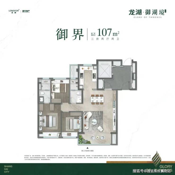 建面约 107㎡三房两厅两卫:刚需改善入门优选,三开间朝南,南向面宽超 10 米,LDK 餐客厨一体化连接南向宽景阳台,主卧豪华套房设计,带独立卫浴与观景飘窗,双卫设计避免早高峰拥堵,完美适配三口之家、首改家庭,总价约 589 万起。