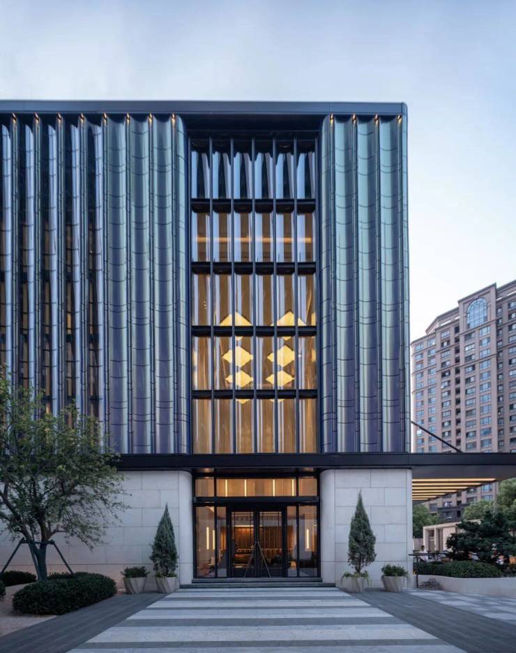 金属铝板外立面:中层与上层采用高品质金属铝板,耐腐蚀、抗老化、历久弥新,搭配精致线条与凹凸肌理,提升建筑的精致度与高级感,在阳光下呈现细腻光泽,彰显顶奢住宅的沉稳大气。