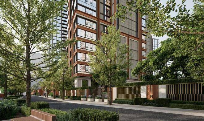 社区景观上,突破市区项目常见的「兵列树阵式」布局,通过建筑楼体的精密偏转,形成罕见的围合式社区形态。