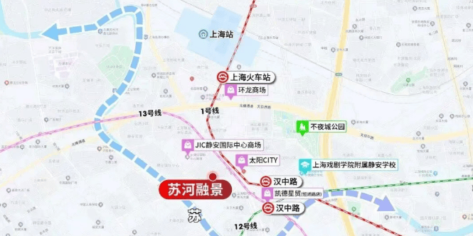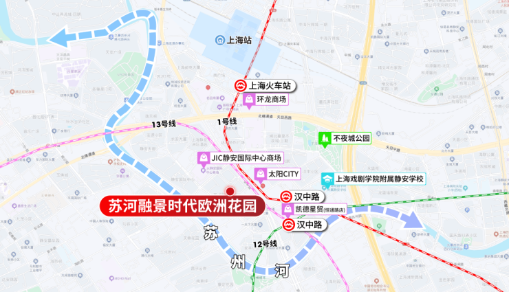 苏河融景,步行约188米1/12/13号线汉中路站! 进站后2站人民广场,2站南京西路、2站北外滩!同时项目近邻东西大动脉北横通道、南北大动脉南北高架以及 内环高架 ,自驾迅捷通勤全城!