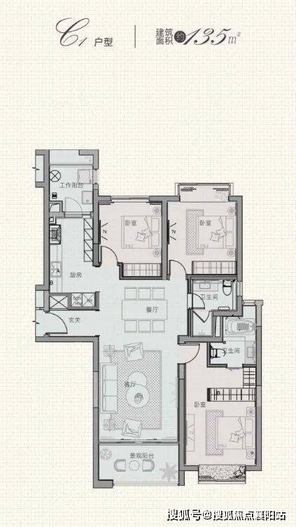 (二)建面约 135㎡ 平层三房两厅两卫 —— 官方主流改善首选(总价约 1500 万)