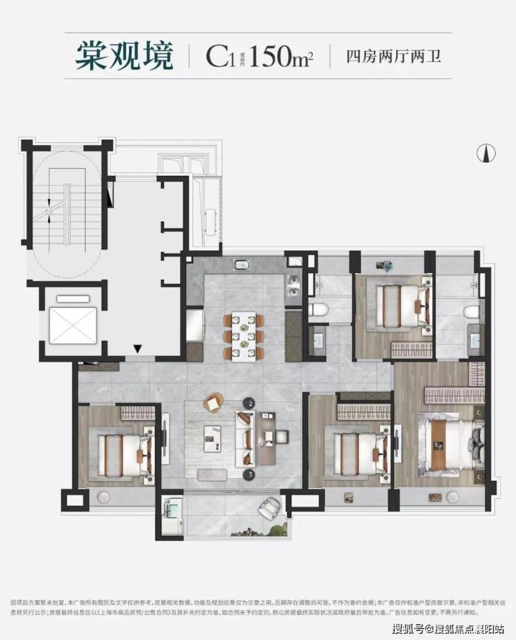 建面约 150㎡四房两厅两卫大平层:总价约 660 万起,改善家庭优选。标准 “大面宽短进深” 黄金格局,四开间朝南,全明通透。独立入户玄关,兼具收纳与私密性;餐客一体化设计,空间开阔大气;主卧套房配备独立卫浴与衣帽间,居住舒适度拉满;多飘窗设计,拓展实用空间,是追求品质生活的改善家庭不二之选。