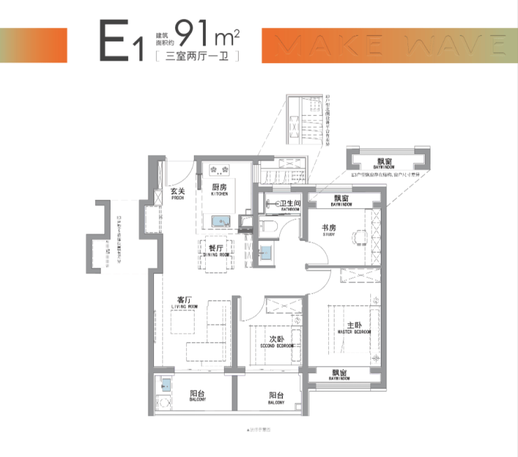 值得一提的是,该户型做到了 “南向双阳台+南北双飘窗” 的设计,在实用性上超越了市场上许多同面积段的产品。