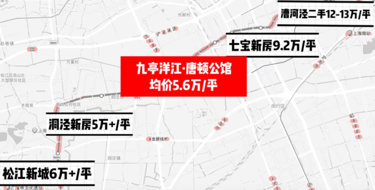 再看看往前5站的漕河泾,区域内的二手新房价格已经来到13万+/m²!往后的松江新城,新房也站上了6万/m²!对比之下,洋江·唐顿公馆是当之无愧的价格洼地。