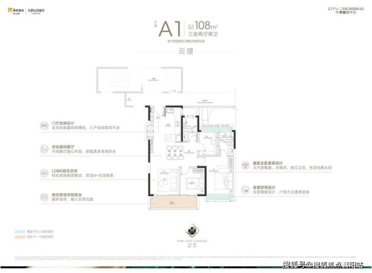 建面约108㎡的三房两厅两卫, 总价约700万起,门槛友好, 年轻家庭置业中环的不二选择。