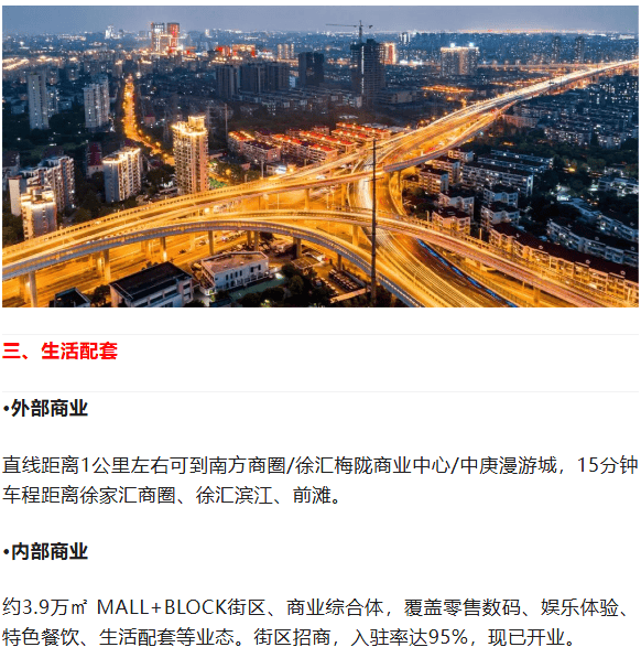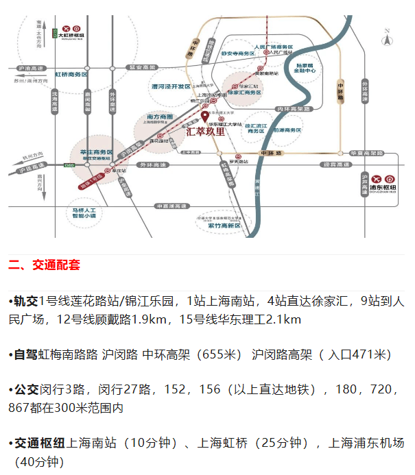 高架: 项目周边有5条高架线路环绕(沪闵高架、中环线、虹梅路高架、外环线、嘉闵高架)方便自驾出行