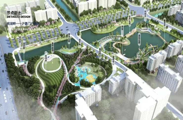 项目 双面临桃浦河 ,近邻约 50 万㎡桃浦中央绿地,生态资源优越。社区内部绿化率达 35%,搭配全龄活动空间,外部享生态公园、内部拥精致园林,真正实现 “出则繁华,入则静谧” 的理想居住状态。