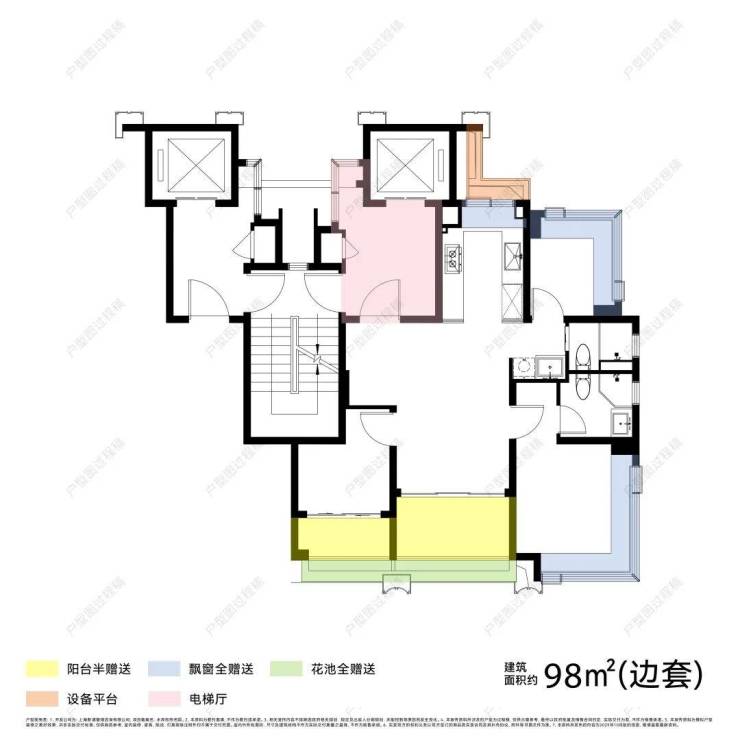 建面约98㎡边套 , 一梯一户+全明独立前厅 ,购房者获得的是一个独立前室,内外双玄关的配置,家的空间,持续延伸。