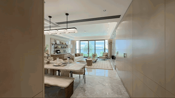 该户型通过将贯通式阳台纳入客厅,整个餐客厅区域形成近 50㎡的方厅 。开敞、明亮, 气场完全对标市面上140㎡以上的大平层。