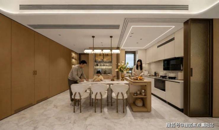 厨房与客餐厅之间没有封闭隔断,这种设计不仅拉大了视觉尺度,更让你在做羹汤时,能与客厅里的家人随时互动, 打破了原本厨房的”孤独感”,赋予更多情感交流。
