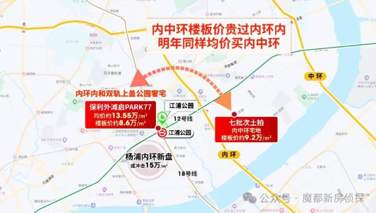 其一,七批次土拍,杨浦内中环宅地 楼板价高达约9.2万/㎡ ,已高过内环内的保利外滩启PARK77(楼板价约8.6万/㎡)。