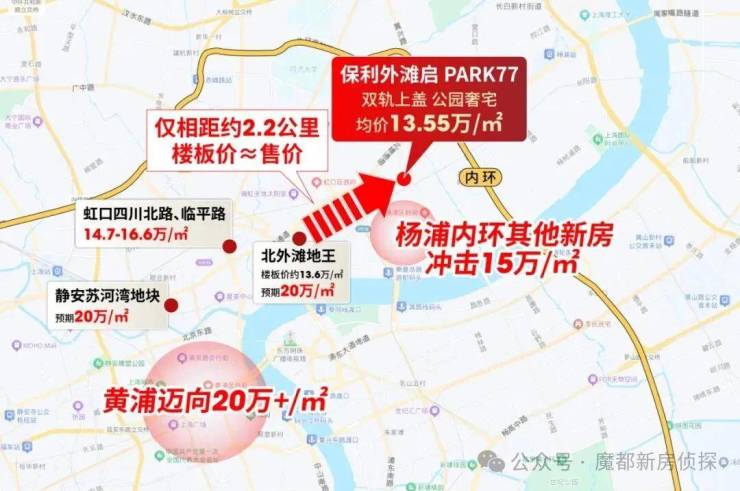 事实上,项目与北外滩地王相隔仅约2.2公里,却呈现出 “地王楼板价≈本项目售价” 的价差,入手机遇一目了然。