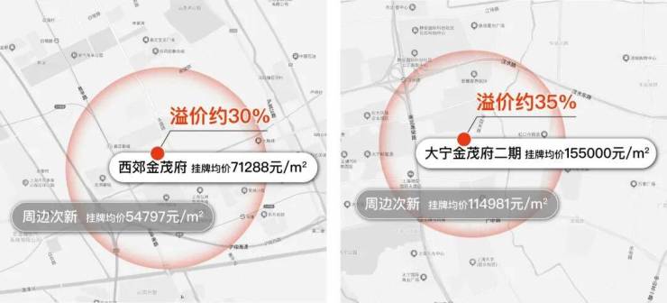大 宁金茂府二期挂牌约15.5万/㎡,周边次新整体挂牌约11.5万/㎡,金茂府有约 35% 溢价;