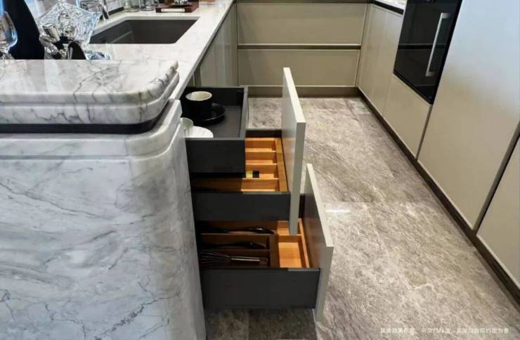 为使厨房成为「真正幸福之地」,璞元在各个细微之处倾注关怀,从地柜拉篮系统,到上柜系统,再到抽屉分格系统,浅抽与深抽搭配,让整个厨房空间,既百变,又充满秩序!
