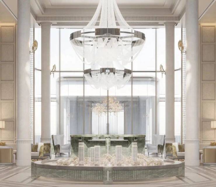 基座更是采用 大面积石材搭配 艺术玻璃及 古铜色金属窗框,辅以奢石、艺术等点缀,从上到下,处处皆是奢华质感。