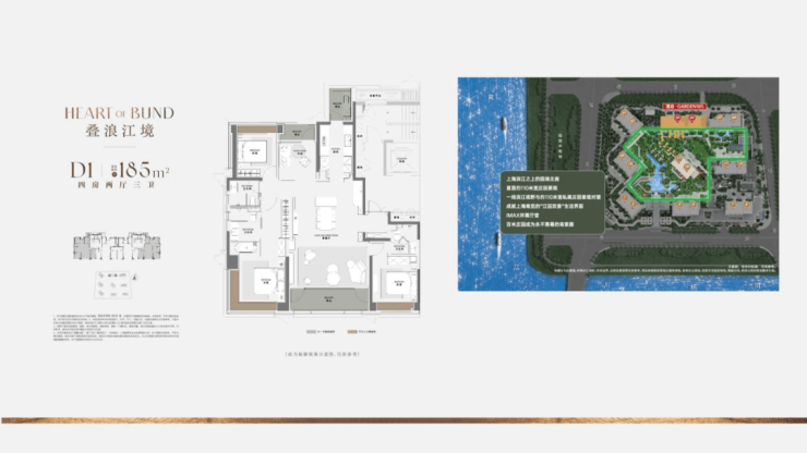 · 澐启・GARDEN185 滨江园境主座 ,堪称滨江之上的栖居典范,以全景环幕视野引江入园,方正通透的空间布局实现采光与视野的双重极致,庄园绿境与滨江盛景相融,每一寸空间都彰显世界湾心的居住格调。