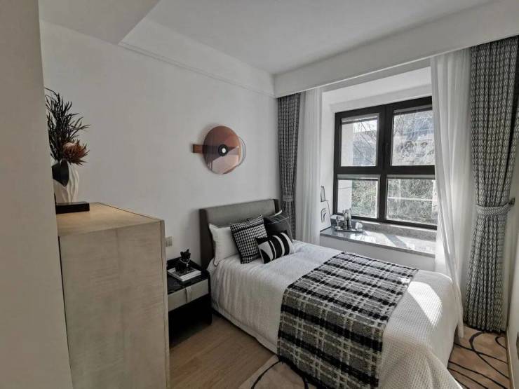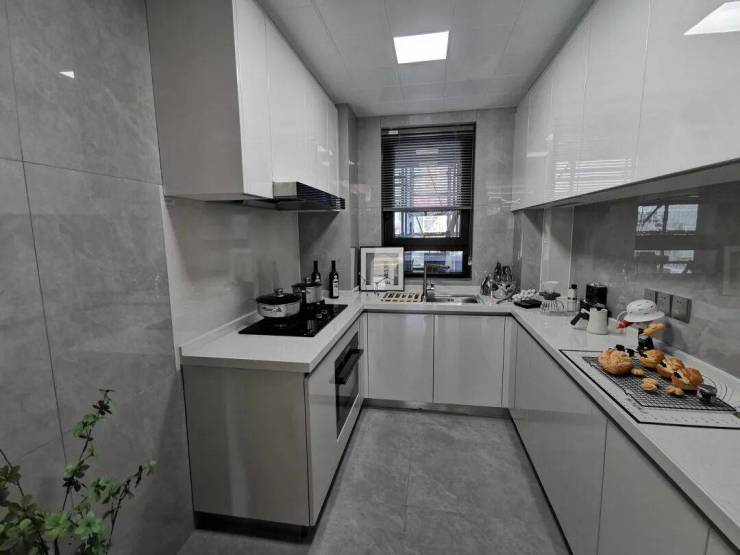U型厨房, 操作台与厨房动线符合人体工学设计,转身之间,洗、切、烹、炒流畅便捷,与餐客厅形成一条笔直的居家生活动线; 三间卧室全附带飘窗 ,拓宽了景观视野的同时,增加了实际空间使用率; 南向主卧做了带独立卫生间的套房设计 ,仪式感和私密性更强。