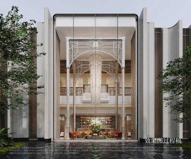 立面上,甄选古铜不锈钢、超白玻璃、天然奢石等高端材质,外立面以米白贝金石、古铜金属、法式蓝灰玻璃构成低饱和度高级色系,质感通透且历久弥新