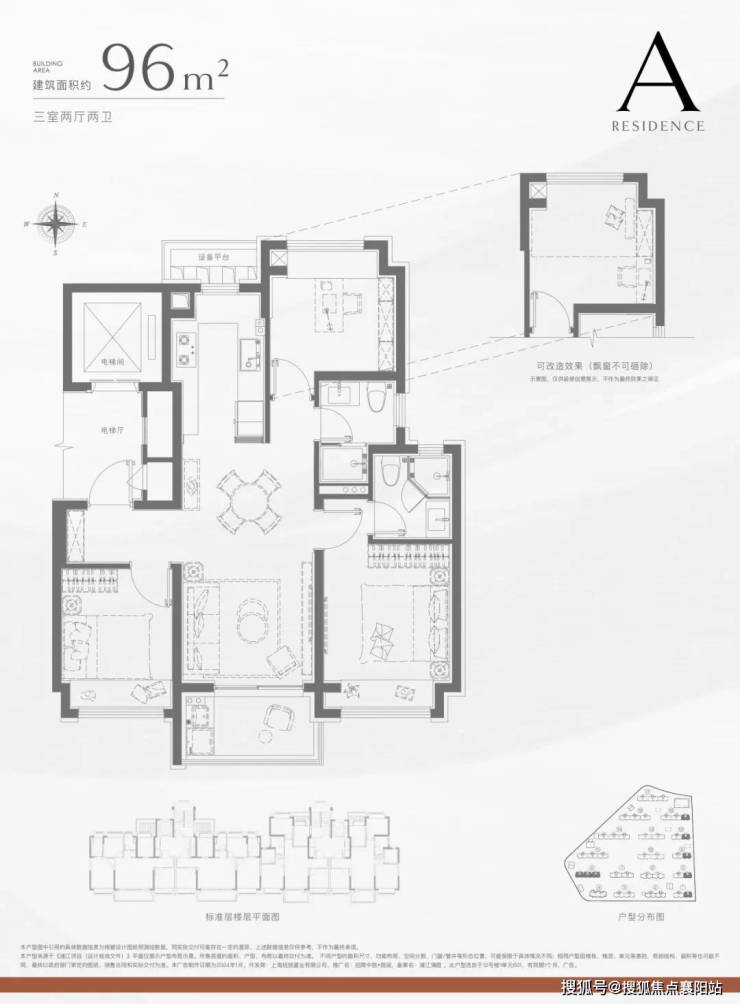 建面约96㎡3房2卫: