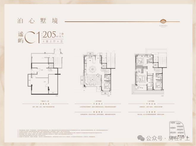 户型特点:下叠边套,南向面宽约9米,客餐厅同宽约5.8米,空间开阔。一楼设南向卧室,采光好且视野佳。二楼为三套房+主卧总统套房设计,主卫南向,可容纳浴缸和双台盆。地下室方正,附赠采光井,利用率高。