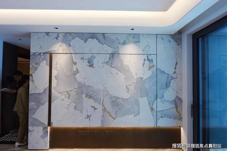 客厅则是弧形转角的悬浮吊顶,无主灯设计,电视机背景墙也是大块的岩板。