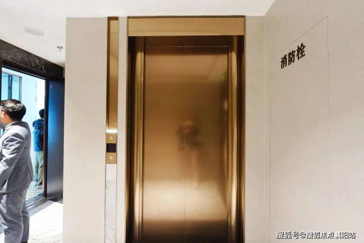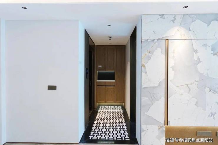 安高这次打造的交付样板间,是从电梯厅开始的。107㎡是一梯两户,电梯间区域,主要以不锈钢条作为通高区域的墙面划分,吊顶带金属弧线。 入户门前,金属面板搭配编织纹,从上方打下来的暖色调灯光,映照在项目logo和室号之上,让业主从电梯里出来走到家门的时候就已经给满了仪式感。