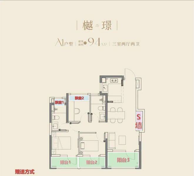 约94㎡起步户型:设计了市场上不多见的南向三阳台,凭借充足(约9%)的赠送面积,实现空间利用率最大化。
