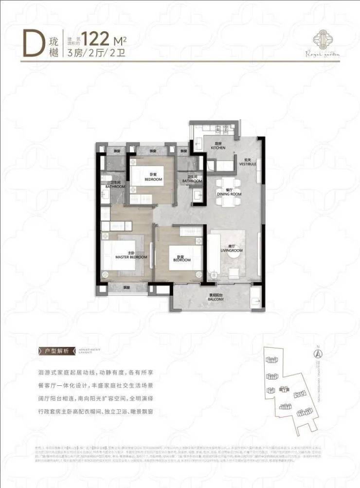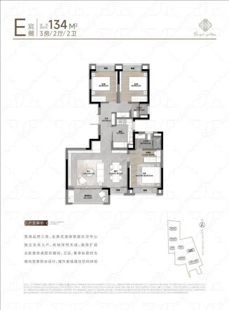 104㎡3户型特点:该户型多为楼栋的 东边套,是一个观景户型。客厅连接270°阳台,视野出众。双卧朝南,阳光满溢。从次卫布局看,如果家庭人口较少,该户型还能做成双套卧。