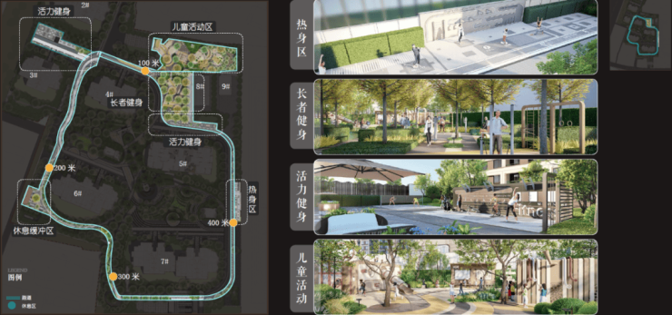 精心设计的环绕社区的 400m跑道系统串联热身区、定制主题儿童活动区、老年健身区、活力健身区和休憩缓冲区五大运动活力系统,家人在社区内锻炼身体的祥和画面呼之欲出。